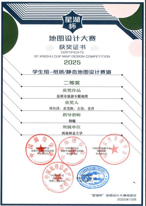 近日,第二届“星湖杯”全国地图设计大赛获奖名单正式公布。由sunbet申搏韩毓老师指导,员工周传淳、黄茂隆、吉浪、裴育共同完成的作品《昆明市旅游专题地图》,凭借其创新的设计理念与扎实的专业技术,在员工组纸质/静态地图设计赛道中荣获全国二等奖。“星湖杯”大赛是由中国测绘学会、中国地理学会、中国自然资源学会等多个国家级专业委员会联合主办的高水平学科竞赛,本届共收到来自全国高校和行业的585件参赛作品,竞争激烈。...