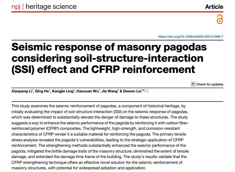 近日,sunbet申搏2022级硕士研究生李小鹏以第一作者身份在中科院一区Top期刊《npj Heritage Science》发表“Seismic response of masonry pagodas considering soil-structure-interaction (SSI) effect and CFRP reinforcement”的高水平论文,该期刊为《自然》合作期刊npj系列,具有较高的学术声誉。