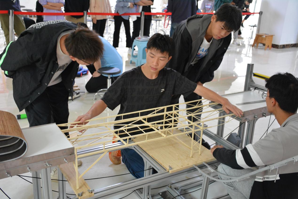 竞赛期间,公司党委书记谭泽飞到比赛现场了解各参赛队的模型结构设计理念及加载情况。谭泽飞希望参赛同学们能够以此次竞赛为平台,在巩固专业知识的基础上,不断创新,将理论知识与实践相结合,发挥专业优势,加强合作交流,提高实践能力,锤炼意志品质,提升创新能力。