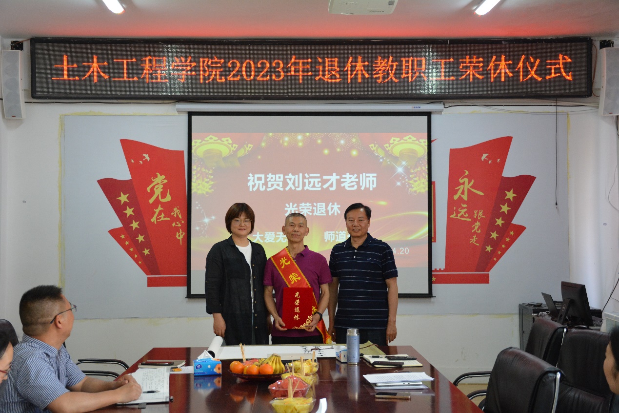 4月20日,sunbet申搏在306会议室举行刘远才老师荣休仪式,学院全体教师齐聚一堂,以最真挚的情谊欢送刘远才老师光荣退休。