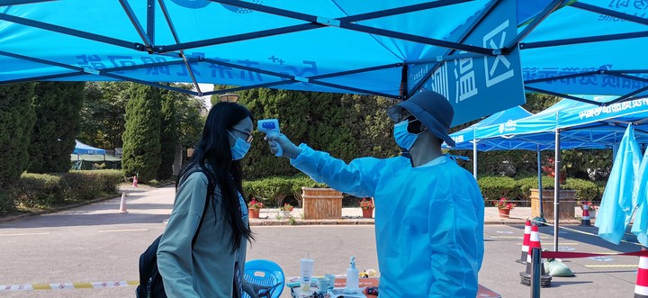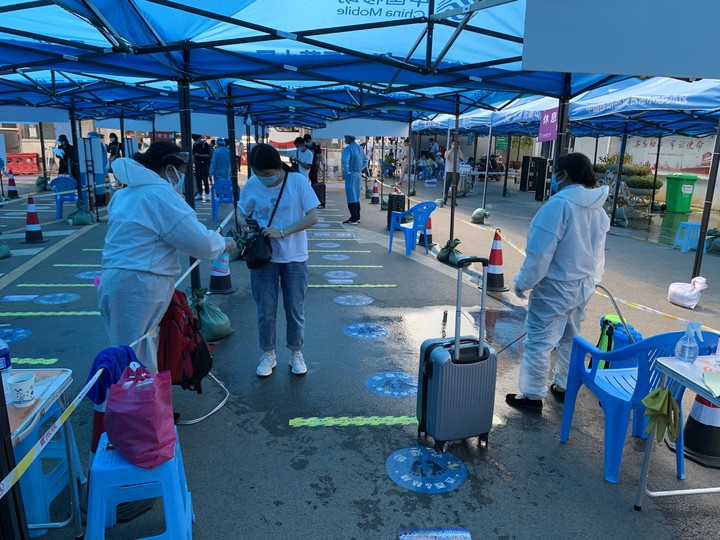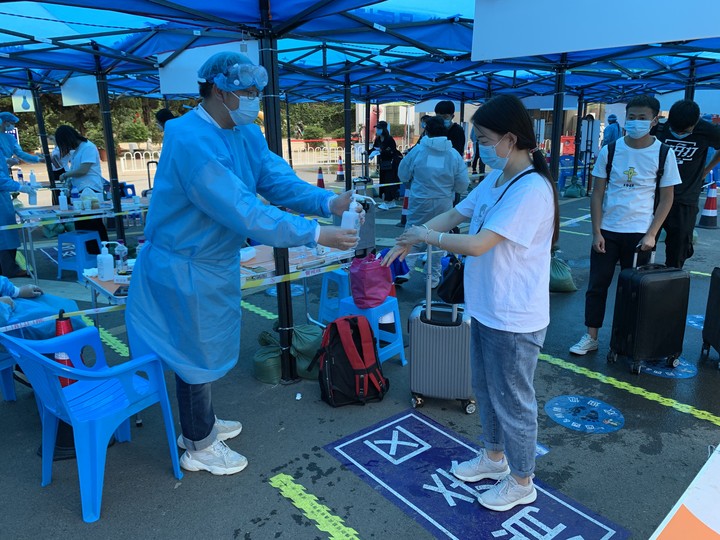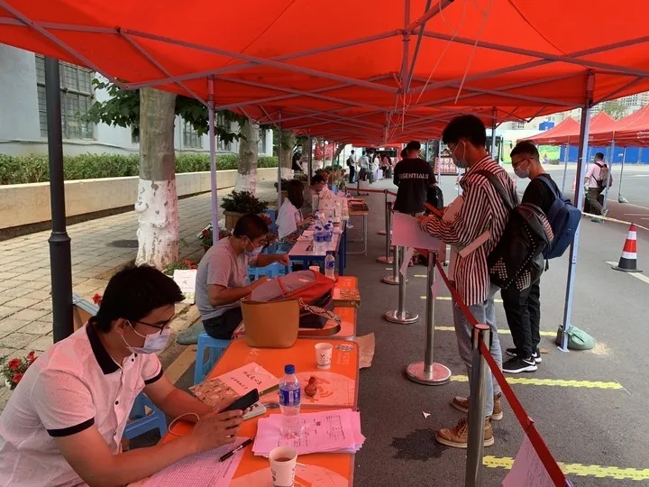 班主任认真检查记录毕业生返校情况,健康材料是否完整。各环节严格把控,相互配合,每一位老师、每一位同学都在积极配合,完成健康扫码、钉钉扫码核验身份、对行李进行消毒、测量体温、到学院点找班主任报到、登记乘车回宿舍等环节。