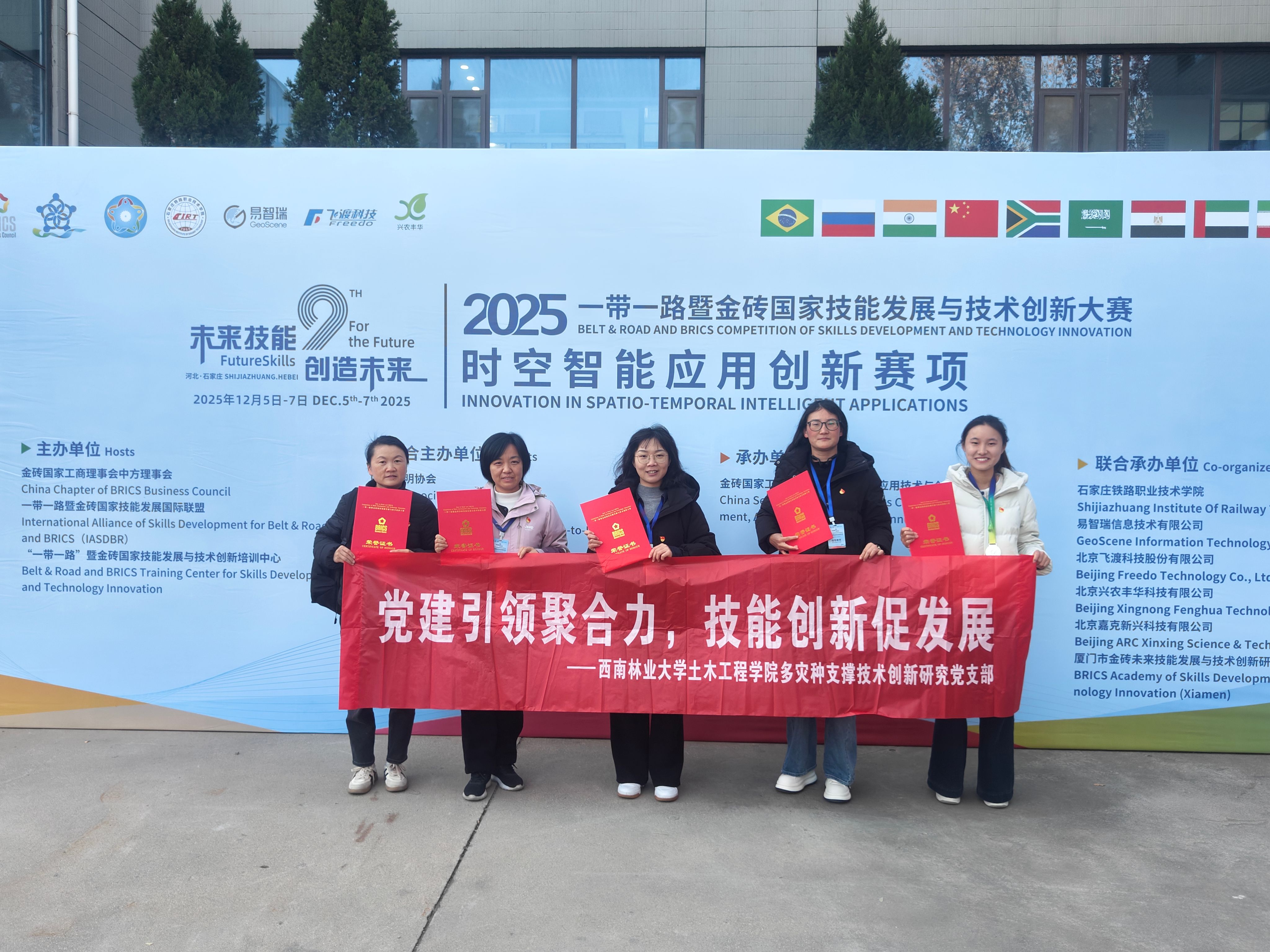 12月5日至7日,2025“一带一路”暨金砖国家技能发展与技术创新大赛时空智能应用创新赛项在河北省石家庄铁路职业技术学院成功举办。在学院多灾种支撑技术创新研究党支部的引领和悉心指导下,测绘工程系师生党员带领参赛团队在此次高水平国际赛事中取得突出成绩,两支员工参赛队分获二等奖和三等奖,韩丽老师荣获教师组三等奖,陈爱梅和罗富丽老师获评“优秀指导老师”,团队同时斩获优秀组织奖。