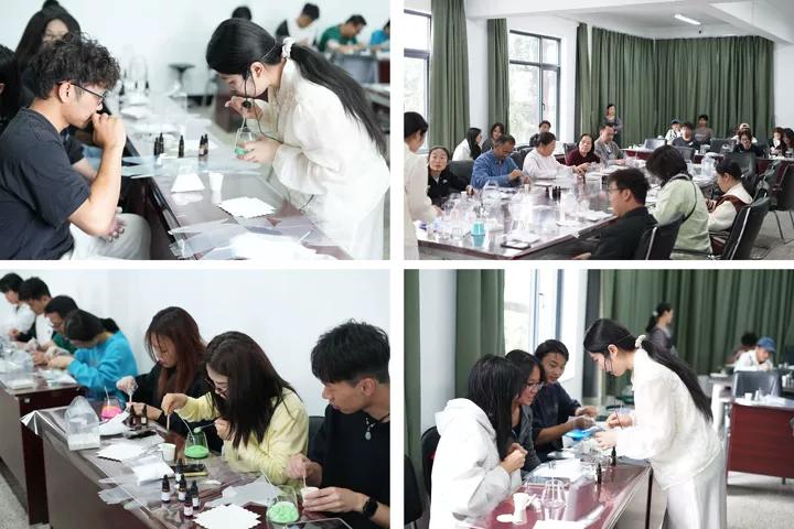 活动现场,在专业老师的指导和示范下,大家纷纷动手尝试。将调色后的彩色沙层层铺叠于玻璃杯中,辅以香薰精油,精心勾勒出渐变的山峦、海浪、繁花、星河等立体图案。平日里与钢筋、图纸和力学模型打交道的土木师生,此刻化身生活美学家,在细腻的沙画创作中交流技巧、分享灵感,现场气氛温馨活跃。